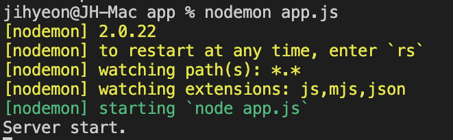 그러면 그림 처럼 nodemon (실행파일)을 입력해서 실행