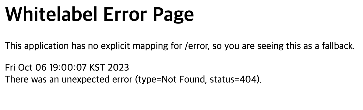 프로젝트 src->hello.hellospring->HelloSpringApplication에서 main을 실행시킨 후 localhost:8080에 접속해 아래와 같은 화면이 나오면 프로젝트 설정이 된 것이다.