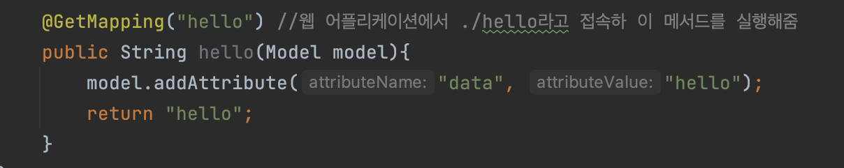 웹 브라우저에서 localhost:8080/hello를 요청하게 되면 helloController를 실행하게 되는데, helloController에서는 hello를 반환하게 된다.